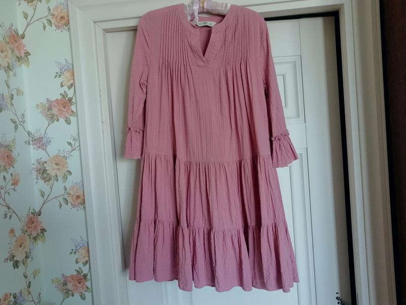 Платье розовое пышное F&F 40 (м-л). Платье в идеальном состоянии, приглушенный бледно-розовый цвет, индийский фактурный хлопок-вискоза на подкладке. Длина по спинке 86 плюс сборки , пог 50, дальше клеш, плечи 38 .
