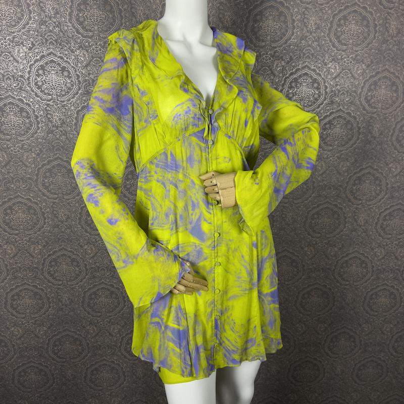 Розмір: 40(М) Довжина: 83 см Плечі: 39 см Рукав: 65,5 см Напівобхват грудей: 47 см Напівобхват талії: 39,5 см Склад: 100% віскоза + всередині підкладка зі 100% поліестеру Стан: нова з біркою