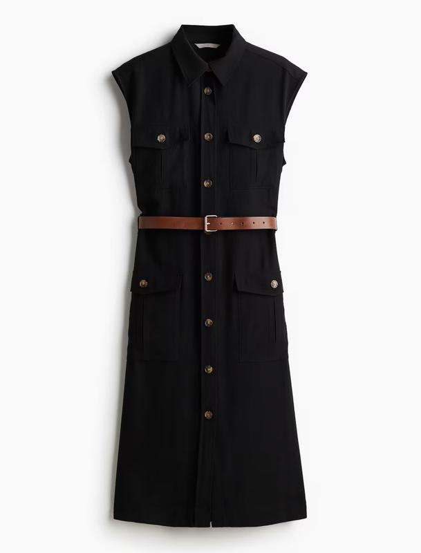 Сукня міді, в карго-стилі. З кишенями, на гудзиках. Ремень загублений.