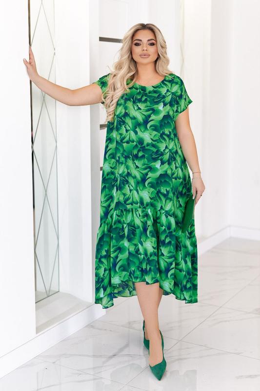 Сукня Модель:69 Ткань: американский креп Цвета: бутылка, мокко, зеленый Размер:48-50,52-54,56-58 (дем) Легкое платье канкан с оборкой по низу изделия, свободного кроя-трапеция (без карманов). Платье имеет особенность: впереди короче чем по спинке. Вымеры по готовому изделию: 48-50. 52-54. 56-58 ОГ-110см 118см 126см ОС-145см 150см 160см Длина переда 114/116/117см Длина по спинке: 124/126/127см Модель представлена в платье размера 48-50!