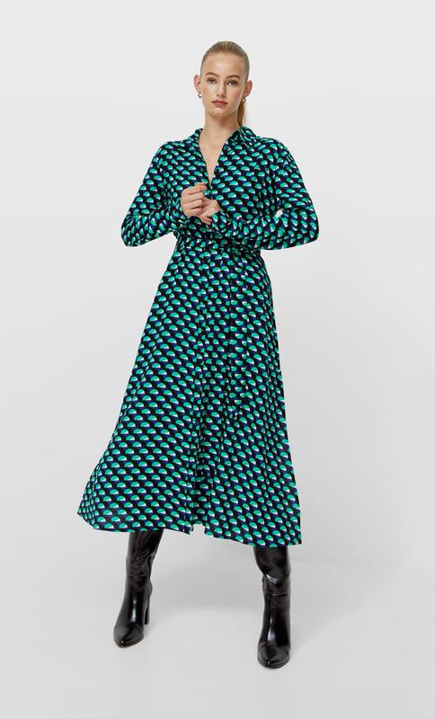 Платье-рубашка мидакси в принт из 100% вискозы от Stradivarius.Комир, длинные рукава и застежка на пуговицы. Отрезанная талия со съемным поясом, расклешенная юбка с разрезом сбоку. Размер XS 165/88A Состав : 100% вискоза Длина - 128 ПОГ - 47 ПОТ - 38 ПОС - 55 Плечи - 39 Рукав - 63