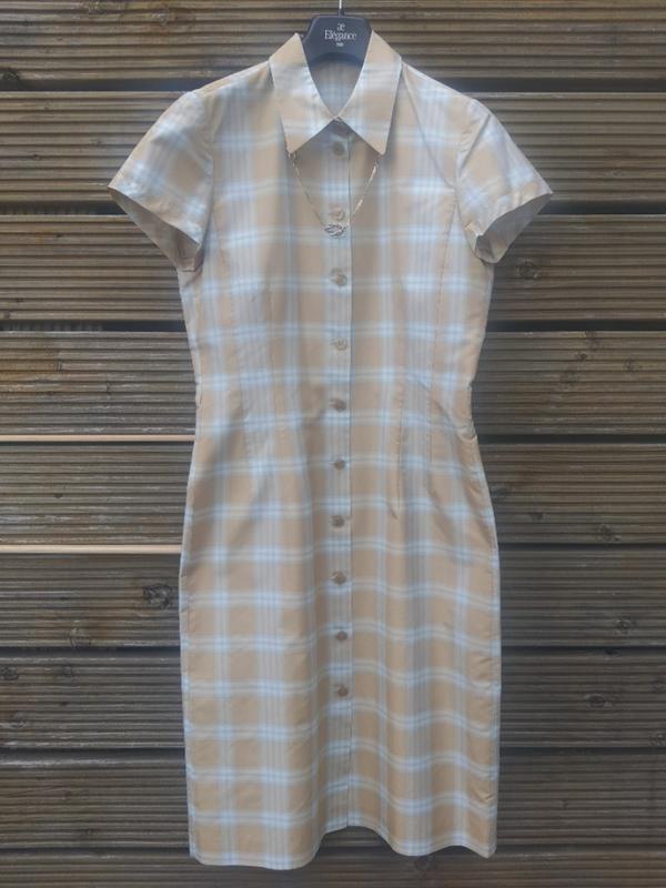 Плаття з 100% шовку, в клiтинку, в стилi Burberry. Бiрка вiдсутння. Дуже якiсна рiч. Камера не передаэ, але колiр: жовто-золотистий, блакитний й бiлий. Стан Нового (дивись по бiрцi зi складом, вона нова, видно, що рiч не прали). Замiри: плечi 39см, пiд пахвами 49см, талiя 40см, бедра 48см, низ 54см, довжина 106см, рукав 15см.