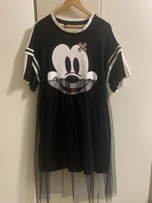 Цікава та стильна літня сукня Напівобʼєм під рукавчиками 62 см Напівобʼєм бедра 65 см Довжина трикотажної частини 97 см, разом із сіткою 117 см Спереду чорний трикотаж із принтом Мікі, позаду білий трикотаж із принтованим надписом