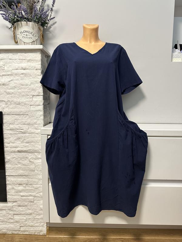 Це жіноча сукня з льону вільного крою. Ось детальний опис: • Матеріал: льон • Колір: темно-синій • Розмір: 2XL • Довжина: 108 см • Обхват грудей (ПОГ): 62 см • Обхват стегон (Бедра): 70 см • Фасон: сукня oversize з короткими рукавами, V-подібним вирізом горловини, боковими кишенями з драпіруванням • Стиль: повсякденний, комфортний, підходить для літнього сезону Не забудьте підписатися на мій профіль,тут завжди можна знайти великий вибір одягу,оновлення щотижня і діють завжди знижки
