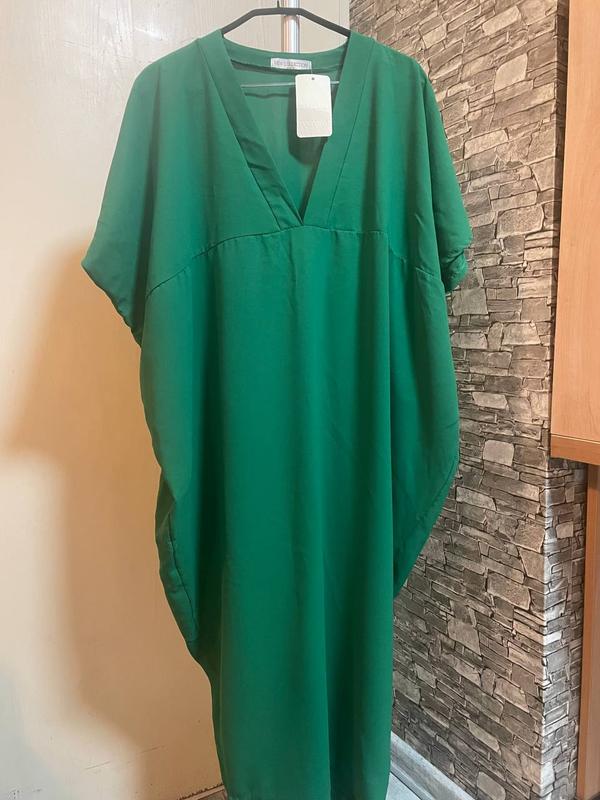 Розмір Л, ХЛ, глибокий зелений колір, приємний на дотик , поліестер з еластаном, довжина 113см, об"єм, овер, все розширене, мікронюанс: останнє фото - потрібно голочкою прихватити розпоріх ззаду.