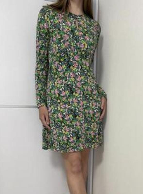 Красивое платье в цветочный принт. Красиво бягает фигуру, тянется. 97% вискоза, 3% эластан рукав 62см пог 53см пот 40см Длина платья 99см
