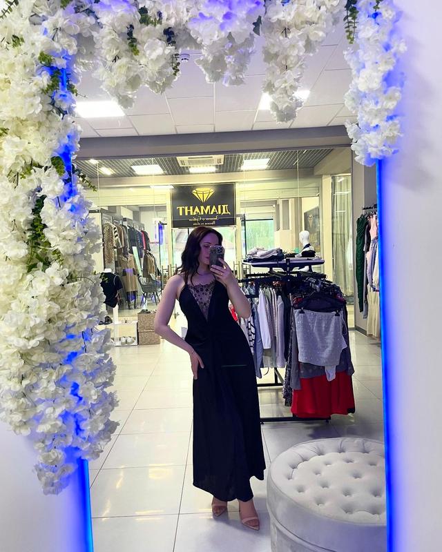 Чорна атласна сукня міді від Zara виготовлена з гладкого блискучого атласу, вона м’яко огортає силует, створюючи елегантний і легкий рух при ходьбі. Верхня частина сукні тримається на тонких бретельках, які перехрещуються на спині, додаючи образу витонченості та легкості. Глибоке V-подібне декольте делікатно оформлене чорним мереживом, що надає образу романтичного шарму. Спинка сукні глибоко відкрита, з тим же V-подібним вирізом, обрамленим мереживом, а дві тонкі бретелі, що перехрещуються, формують витончений акцент і гармонійно доповнюють загальний дизайн.