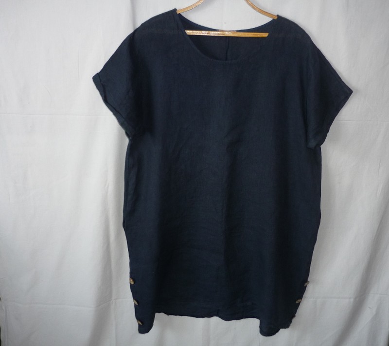Made in Italy 100% LINE. Комфортное платье-оверсайз с карманами темно-синего цвета. Декор - гудзики. Ткань средней плотности, мягкая - идеально для жаркого лета. 100% льон. Замеры: длина - 97 см., ширина плеч - 53 см., плечо - 15 см., пройма - 31 см., длина рукава - 15 см., ПО рукава - 24 см., ПОГ - 65 см., ПО бедру - 72 см., Поделка - 73 см. Размер не указан, ориентируйтесь на замеры.