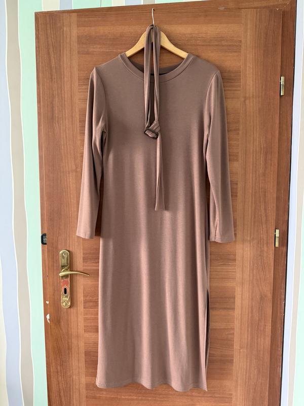 Трикотажна сукня в ідеальному стані приємного колір у пудра. Довжина міді нижче коліна з бічним розрізом. Загальна довжина від плеча 121 см. ПО талії 40 см. Можна носити з поясом на талії