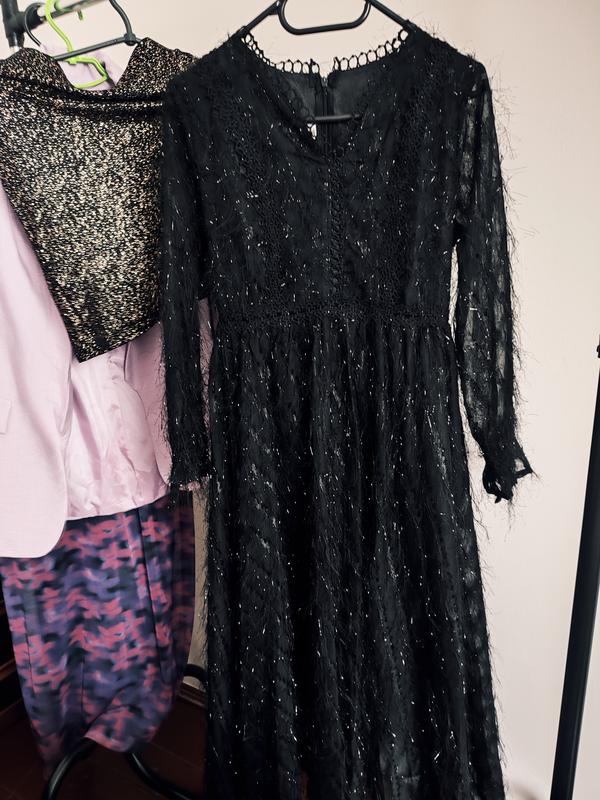Платье -Пластье размер S-M цвет:черный🖤🔥 длина по спинке:110см рукав от плеча 54см полуобъем груди 43см полуобъем талии 34,5см по бёдрам свободно зомочек по спинке есть подкладка кружево отделка в стиле травка ориентация по замерам👆