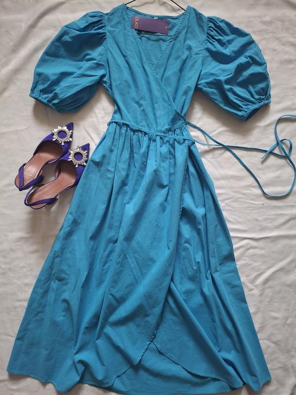 Изысканное натуральное платье-миди на запах Невероятный разрез Платье однотонное, красивый голубой цвет только подчеркивает его простоту и красоту 100%бавовна Цена магазина 1500 грн длина 123 см ПОГ и ПОТ на запах, регулируются завязками перчатки-фонарики