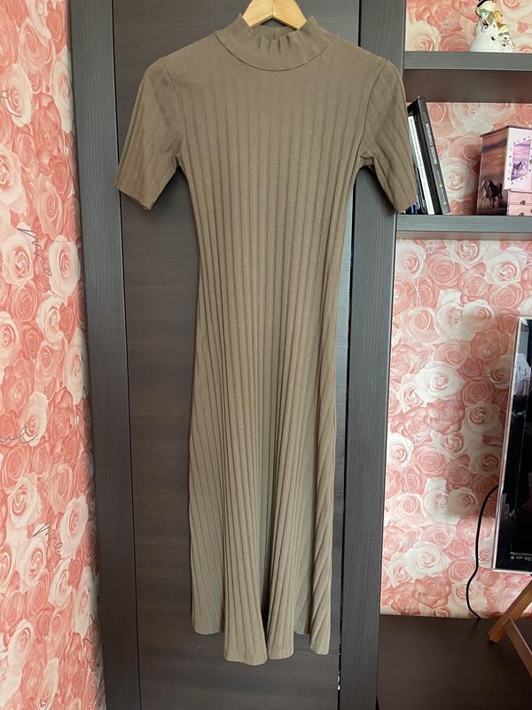 Сукня міді Зара, розмір S. В рубчик. Трохи «розклішонна». Чудова сукня і в ній дуже комфортно. Колір щось між коричневим, сірим і хакі. Довжина 120, груди 36,
