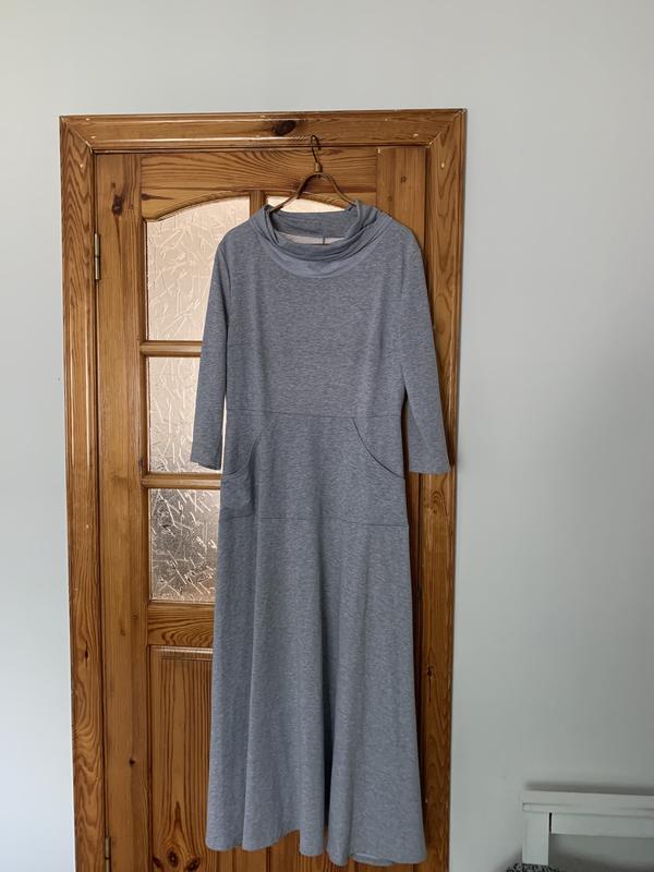Сіра довга сукня, ідеальний стан, вдягалася кілька разів, спереду є кишені, типу, кенгуру Напівобʼєм грудей: 55 см Напівобʼєм талії: 47 см Напівобʼєм бедер: 70 см Довжина: 145