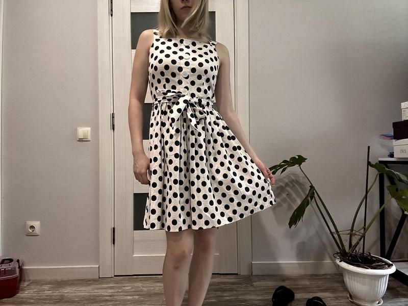 Продається елегантна сукня в ретро-стилі з гороховим принтом, не нова, але в хорошому стані. Біла тканина з чорними горошинами, без рукавів, з квадратним вирізом і кнопками спереду. Має пишну спідницю до колін і пояс на талії для підкреслення силуету. Чудовий варіант для легкого літнього образу. Розмір — універсальний S. Параметри моделі: 81*66*92, 163 см.