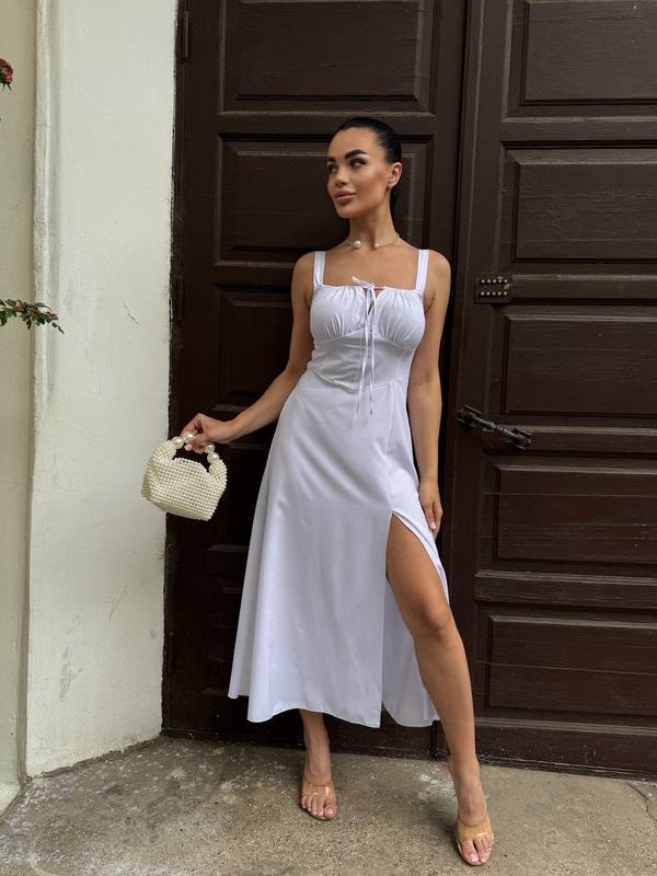 Арт 1492-1063 Сукня 🔘Розміри - 42-44, 46-48 🔘Кольори - білий, рожевий 🔘Тканина - софт 🔘Ціна 660 грн Гарна сукня - сарафан зі шнурівкою та імітацією корсету, на усі випадки літніх днів. Збірка на грудях додає обʼєму та гарно підкреслює. Невеликий грайливий розріз на ніжці. Від талії йде вільне пишненьке. Тканина приємна до тіла, не просвічується.