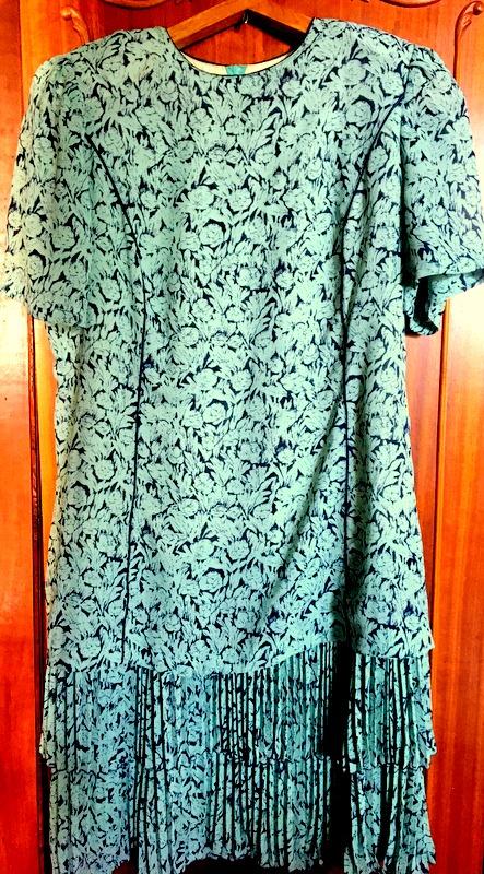 Яркое летнее платье интересного кроя из своего гардероба.. Выглядит как юбка плиссе и длинный блузон. Платье на подкладе с подплечиками на липучке. Имеет небольшой недостаток.Подложи под руками едва поврежден. Фото 8. Это не влияет на вид всего платья. НОГ -58см НОТ - 53см НОС - 61см Длина изделия - 103см Длина блузона - 75см