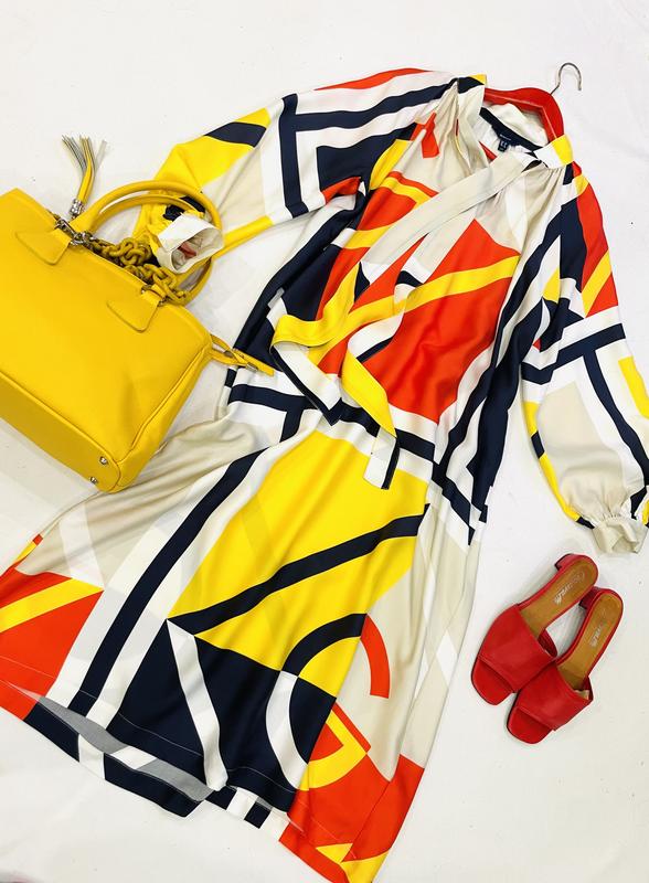 Женское платье Gant с оригинальным принтом в виде контрастных цветных блоков и ромбовидным логотипом G. Крой оверсайз , собраны рукава реглан с манжетами на пуговицах, V-образный вырез с узким бантом для завязки и сборки на ловушку. Ткань на ощупь очень комфортная 100% Лиоцелл Очень оригинальная вещь современного кроя, которая идеально освежит ваш летний гардероб. Размер s-m