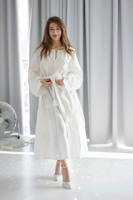 Жіноча біла сукня вишиванка міді, плаття з вишивкою білими нитками з поясом