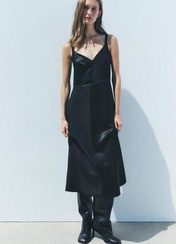 Сукня -,сліп середньоі довжини з ацетату на бретелях.з v- подібним вирізом. По бірці xs, підійде на s.Тканина на дотик схожа на атлас . ПОГ- 42, ПОТ- 39,ПОБ- 51. Довжина 126см.