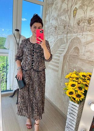принтованное шифоновое платье, имитирующее костюм подарит вам класс и комфорт, оно отлично подходит для деловых встреч, вечеринок и прогулок на свежем воздухе легкая, хорошо драпирующаяся ткань хорошо смотрится на девушках с любыми формами, скрывает возможные недостатки и подчеркивает достоинства платье свободного кроя с рукавами чуть ниже локтя, круглым вырезом, приталенной верхней частью с защипами на талии и эффектной плиссированной юбкой внизу, выполненное из креп шифона высокого качества с удивительно красивым принтом на подкладке по всей длине, платье украшено симпатичными пришитыми пуговицами спереди размеры 50, 52, 54, 56, 58 в зависимости от размера длина 126-128 см, объем груди по изделию 114+4 до 130 см, длина рукава от шеи 50-52 см код L3928-190