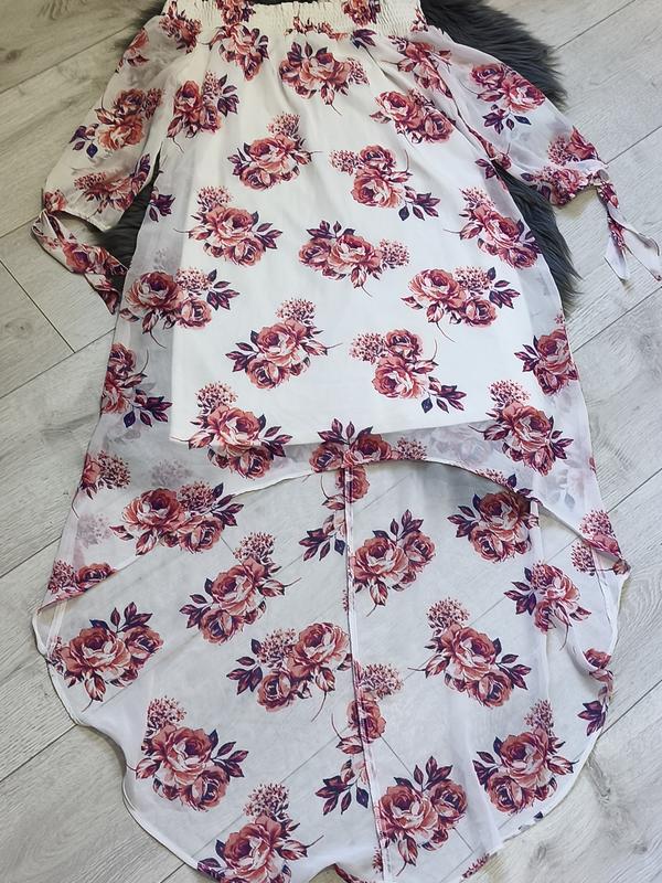 шикарна святкова зефірна сукня з хвостиком на плечі,рукав на зав'язку,на резинці плечики , оверсайс на підкладці,нова,принт троянди