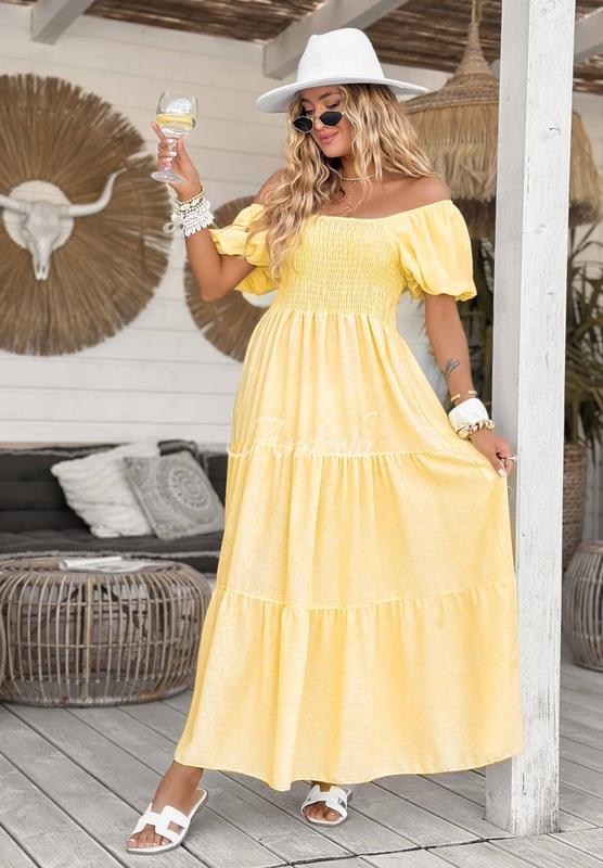 Мод 344 Тканина: муслін Розміри: 42–44, 46–48, 50–52 Сезон: весна/літо Ціна: 920 грн.имма Літня максі сукня з відкритими плечима, пишними рукавами-буфами та еластичним ліфом. Легка, повітряна, ідеальна для відпустки та літніх прогулянок.
