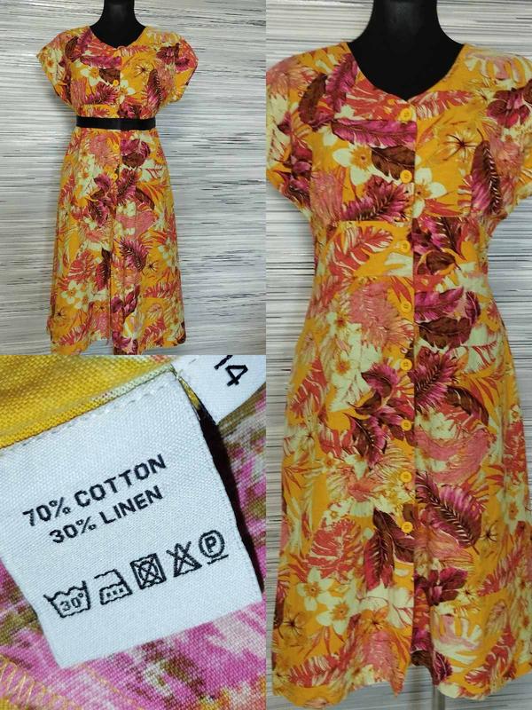 Розташований у самому серці сільської місцевості Йоркширу та натхненний багатою текстильною спадщиною графства, сімейний бізнес пристрасно працює, щоб пропонувати клієнтам високоякісний та доступний жіночий одяг. Alice Collins Комфортна сукня-халат міді довжини з насиченим принтом тропічних квітів на гудзичках по всій довжині бокові кишені комфортна посадка,А-силуетний подол, розмір L,хоча по бірці XL,але як на мене для комфортної посадки L оптимально звіряйте заміри довжина 107 см ( ідеально як міді-підійде для невисокого зросту) ПОГ 48-54 см,пошив чуть розширений,пройма рукава комфортна,не надто відкрита ПОТ 49 см тут уважно,бо не тянеться (не більше) ПОБ 60 см 70% бавовна 30 % льон,добротне полотно,середньої щільності,не обтяжує,приємне тактильно Загалом, це яскрава, зручна та практична сукня, ідеальна для повсякденного носіння. ІДЕАЛЬНОГО СТАНУ,абсолютно,без будь-яких нюансів