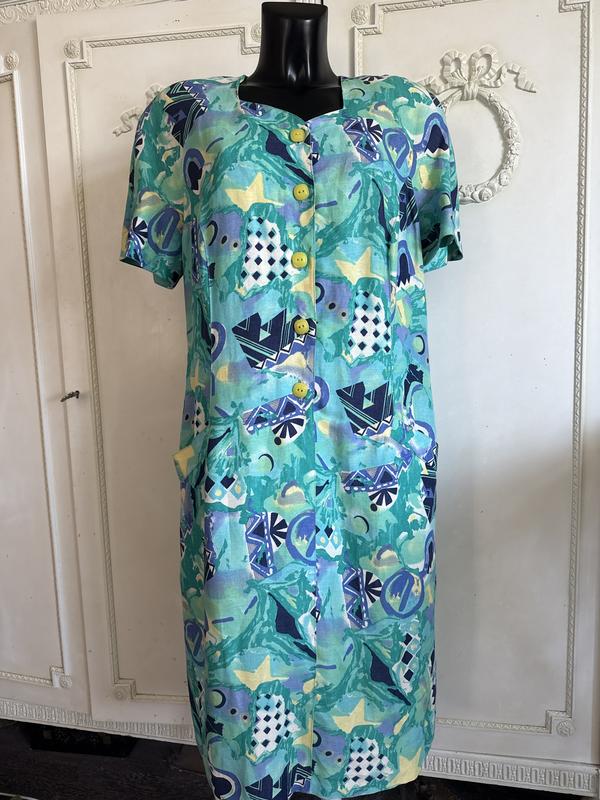 Чудова якісна вінтажна сукня міді. Склад:льон/віскоза(56/44). На підкладці по всій довжині. Два зручних кармани, застібка на ряд ґудзиків спереду до лінії бедра. Чудова лінія плеча, є підплічники. Яскравий позитивний визерунок. Сукня супер. Розмір по бірці-46. Заміри: довжина -112 см, ПОГ-55 см, ПОТ-51 см, ПОБ-57 см. Стан ідеальний!