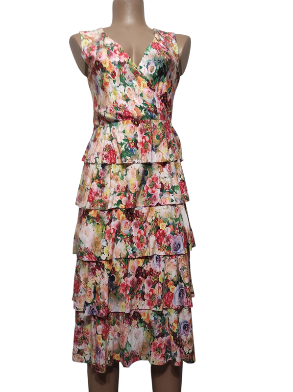 Яркое платье с оборками , бирки с размером и составом не нашла, но похоже на вискозу, без дефектов. Длина от плеча 111см.+- П/о груди подмышки 42см.+-, запах, тянется. П/о подреза под грудью 37-38см.+- П/о бедра 48см.+-