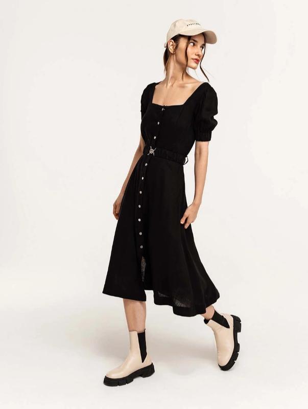 Длинное платье с низким прямоугольным вырезом на груди и спине. Пышные короткие рукава на резинке. Эластичный пояс с пряжкой замком в комплекте. Боковые карманы в швах. Легкое летнее платье из вискозы и льна. Отсутствие первой верхняя кнопка, замененная на пуговицу. длина 109 пот 39 пог 46