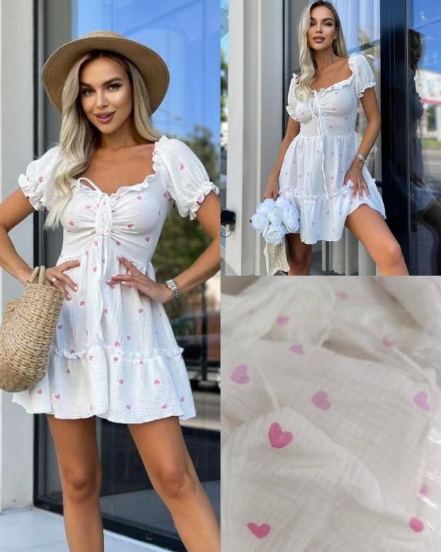 Гарнющі, ніжні,легесенькі на літо🦋 ♥️Стильне літнє плаття з рюшами, регулюється висота декольте♥️ Розміри: 44,46 Тканина:муслін (не парить,натурал.) Кольори: білий з ніжним бузком сердечка. Заміри: 💛Обхват грудей 44р-84см 46р-88см 💛Обхват талії 42р-70см 44р-72см 46р-74см 💛Обхват стегон 44р-124см 46р-132см 💸Ціна:499 грн Ставте + в коментарях щоб замовити