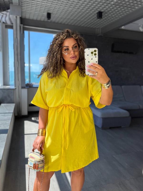 Плаття Арт 2587 Тканина батист жатий Колір чорний, жовтий, блакитний, мокко Розмір 54-56,58-60 Плаття затягується на куліску, позаду на талії резиночка, з кишенями, рукав цільнокроєний. Тканина дуже легка, не парить, приємна до тіла