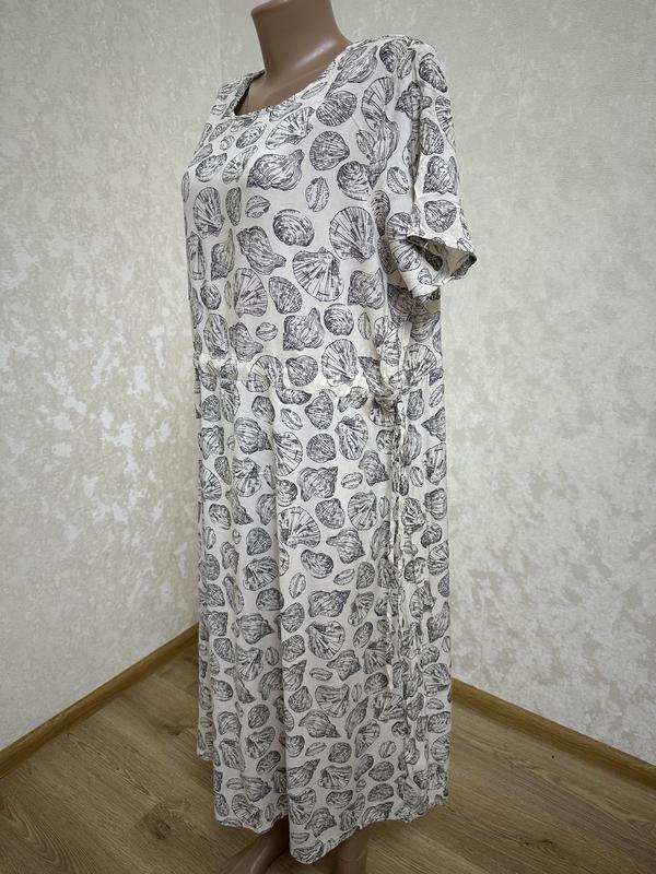 Ніжна віскозна сукня По поясу підтягується на шнурівочці.Принт мушлі. Виміри: ПП 43 ПГ 64 ПТ 60 ПС 70 Низ 87 Довжина 118 Рукав 27