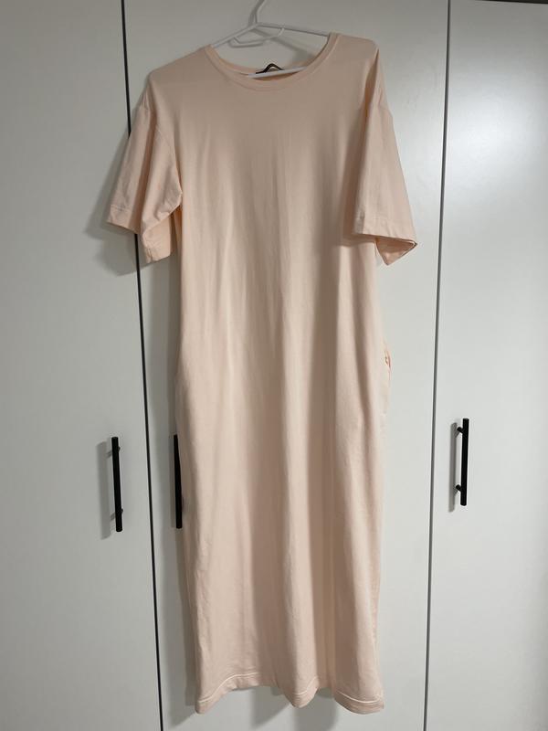 Плаття оверсайз, ніжного кольору, вживу більш до персикового, має дві кишені, стан нового (одягала один раз), чудово підійде на літню погоду , легке, приємна до тіла тканина Довжина 127 см Розмір С але вільного крою, тому підійде і на М-Л