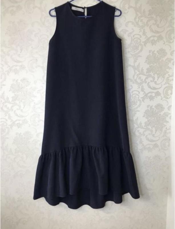 Стан відмінний. Лаконічна темно-синя сукня без рукавів, прямого крою. Асиметрична довжина з подовженою спинкою та воланом по низу виглядає дуже стильно й елегантно. Легко поєднується як з класичним, так і з повсякденним взуттям. Підійде для роботи, прогулянок або подій. 📏 Розмір Орієнтовно S–M (44–46) Орієнтуйтесь на заміри: ПОГ — 44 см (напівобхват) Довжина: спереду — 108 см, ззаду — 122 см