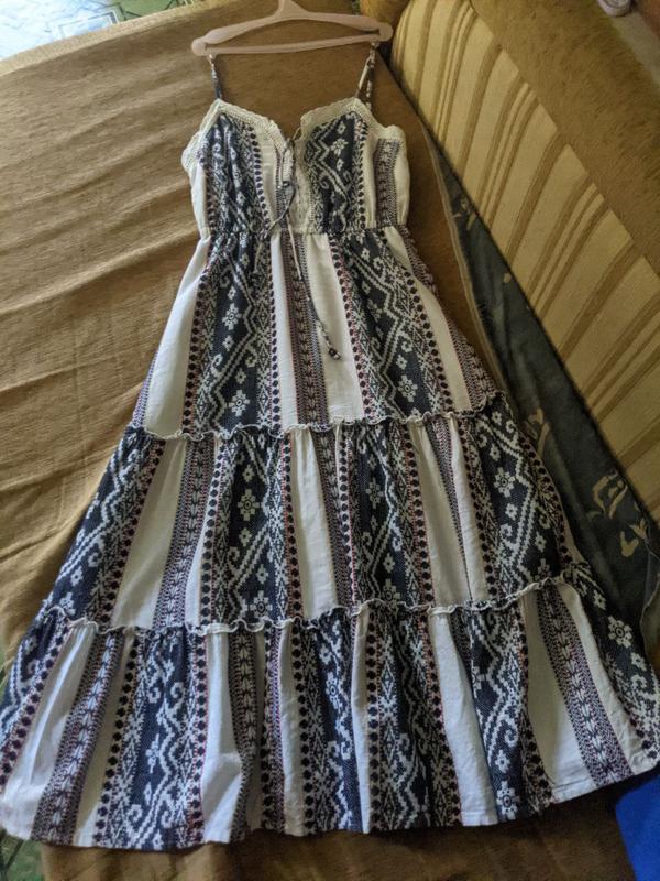 Ніжна та легка сукня з етнічним візерунком.Тонкі бретелі, мереживна обробка декольте та зав’язки з китицями додають романтичності. Еластична талія підкреслює фігуру, а багатоярусна спідниця красиво струмує при ході. В гарному стані,без дефектів тільки не має бірки з описом матеріалів.На грудях регулюється завязочками. Розмір:S Судячи по тканині щось натуральне і приємне на дотик, але що саме не знаю,не має бірки. Я цю сукню уявляю десь на фотосесії в полі із соняшниками,із солом'яним капелюхом або просто виїхати кудись за город до озера.Мені здається в цій сукні почуваєш себе прям дівчинкою,легкою,повітряною, ніжною