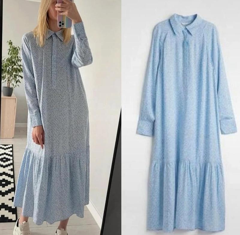 Бренд: H&M Розмір: 34 (XS) Стан: Як нове , ідеальне Матеріал: 100% віскоза Колір Ніжно-блакитний з дрібними квіточками принтом Легке міді-плаття від H&M із віскози — ідеальний варіант для весни й літа. Модель з довгим рукавом, сорочковим комірцем та застібкою спереду на ґудзики до пояса . Вільний фасон з легким розширенням донизу забезпечує комфорт та стильний силует. Підійде для офісу, прогулянок чи подорожей.