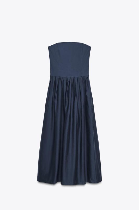 Сукня міді з прямим вирізом і відкритими плечима. Деталь зі складками. Комбінована внутрішня підкладка. Бічна застібка-блискавка, прихована в шві. Темно-синій/блакитний | 4661/219/401