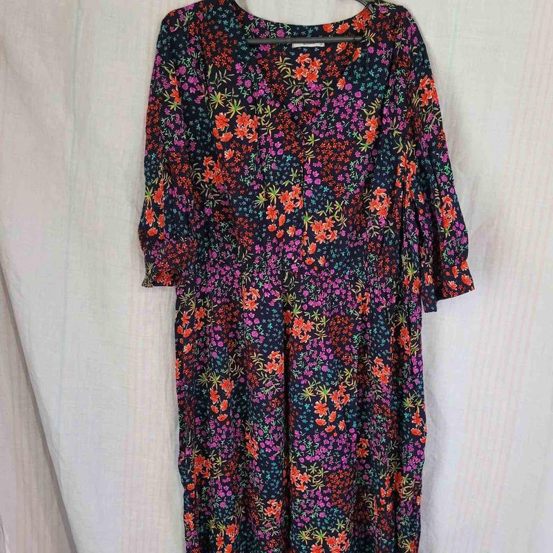 Вискозное платье, талия сзади на резинке, спереди до талии застегивается на пуговицы, рукав на манжете с пуговицей.Темно-синее. Новое, без бумажной этикетки, люкс сток. Ог 130. талия 102+, Об 154, рукав 41,длина 115.