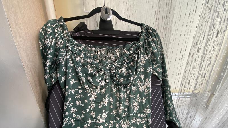 Зелена сукня в квітковий принт з розрізом на ніжці Має гарний виріз та рукав 3/4 зверху на резинці що дає зможу носити сукню з спущеними плечима Напівобʼєм грудей - 34 Довжина - 123