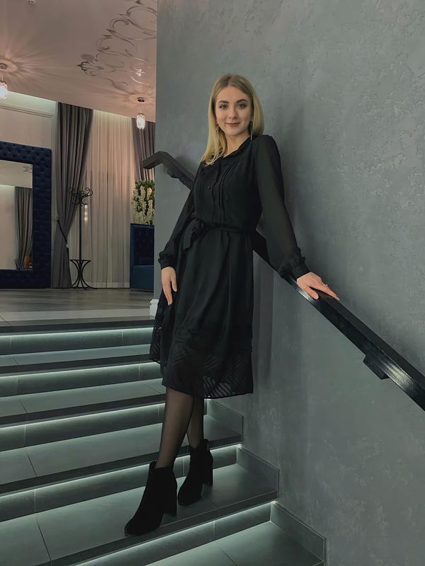 Стильна чорна сукня з легкої напівпрозорої тканини. Підійде для святкових подій, побачень чи вечірніх виходів. Розмір: S/M Матеріал: шифон з підкладкою Довжина: міді Рукав: довгий, напівпрозорий Талія підкреслена паском