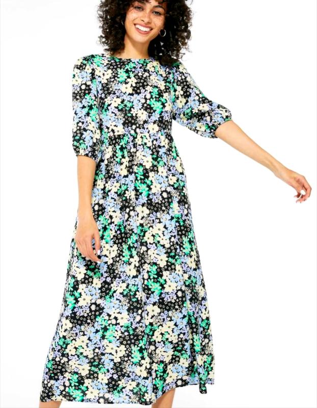 Сукня міді в квітковий принт New Look, в ідеальному стані без нюансів. З завищеною талією в стилві ампір. Приємна і комфортна до тіла тканина. Віскоза 100% Розмір S-M Довжина 112 см Рукав від горловини 42 см ОГ 88-92см ОТ 66-75см ОС 90-100 см