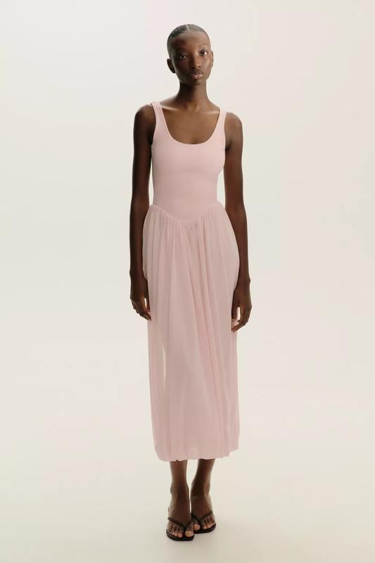 Довга сукня з круглим вирізом та широкими бретелями. Комбінована тканина з тюлю в тон. Деталь зі зборками. БЛІДО-РОЖЕВИЙ | 5584/802/622