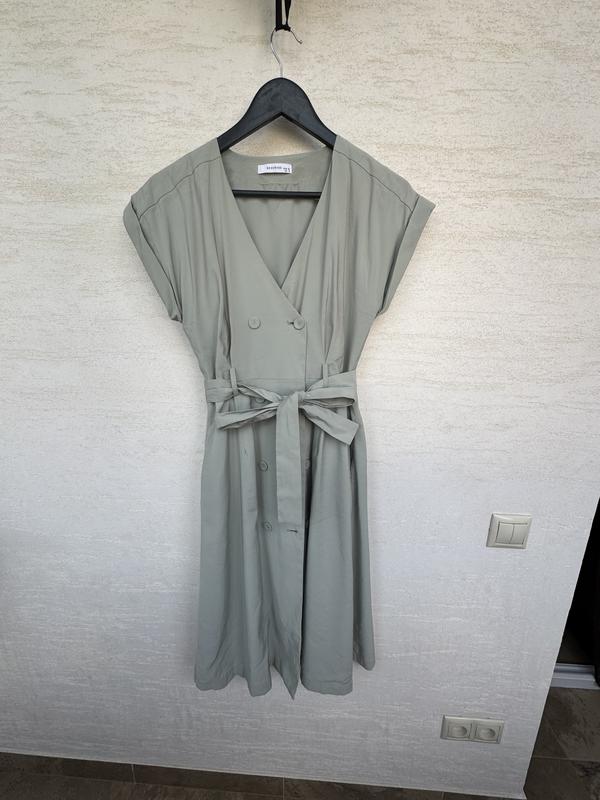 Сукня Reserved світлого сіро-зеленого кольору (фіставшкового). Двубортне, спущений рукав, за шипи спереду і на спинці, талія - відрізана, V виріз, кармани, юбка - A-силуету. З підкладок. Ідеально підійде для офісу чи на прогулянку. Добре виглядає як з кедами, так і під невеликий каблук. Класно підкреслює фігуру. Без дефектів. Вдягалось двічі на зйомки.