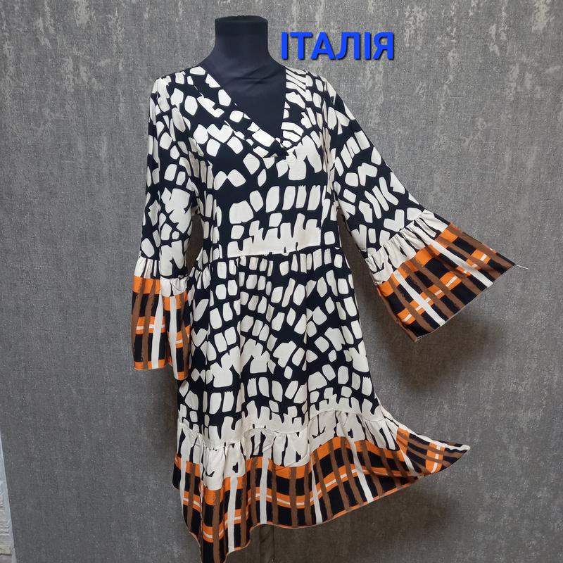 СУКНЯ В СТИЛІ БОХО ВІЛЬНОГО КРОЮ . -100%ВІСКОЗА (високої якості,прохолодна та дуже приємна до тіла тканина 👍 -Виробництво Італія 👍 -Розмір не вказано,так як вільний крій,то коливається від L до XL,XXL.(орієнтуйтесь будь-ласка по замірам в описі. -Модель має комфортний крій та силуэт який не створює додаткового об'єму . -ЗАМІРИ: -ПОГ- 55см. -ПОТ- 55см. -ПОБ- 82см. -Довжина по спині- 105см. -Плечі- 44см. -Біцепс напівобхват-19см.