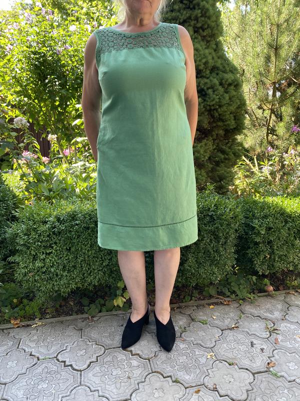 Літня сукня світло зеленого кольору, складу 50% льон, 50% котон. Спереду на грудях мереживо. По рукавам, подолу і горловині зроблена мережка. В бокових швах є кишені. Розмір вказано 18, мій розмір, я приміряю на 18(44) 165 см, то сукня дуже облягає, краще сяде на розмір менше. Дивіться заміри і замовляйте безпечну оплату. Заміри: НОГрудей 56 см ( я приміряю на ог 115 і мені туго) Талія 54 см Стегна 58 см По низу 69 см Довжина по спинці 90 см