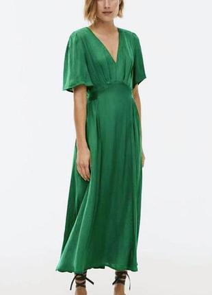 платье насыщенного тёмно-зелёного оттенка из лёгкой струящейся ткани с мягким сатиновым блеском. V-образный вырез, короткие свободные рукавами. юбка плавно спадает до щиколоток, создавая женственный и элегантный силуэт. пог-49 см пот-41 см (регулируется поясом сзади) длина -128 см подойдёт на s-m