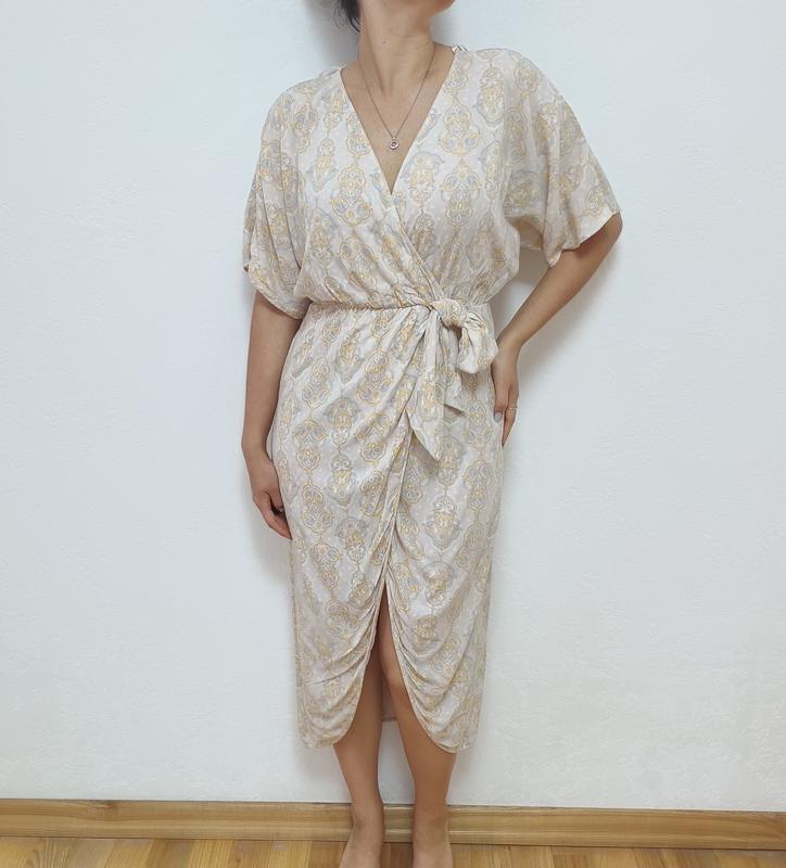 Легка віскозна сукня від всім відомого бренду Pull&Bear. Виготовлена вона з якісної 100% віскози: легка, м'яка, вкрай ніжна та приємна до тіла, з шорохуватою текстурою, не просвічує. Сукня має цікавий крій, який дещо перегукується з стилістикою 1930-х років: об'ємний верх, розслаблена лінія плечей, окреслена лінія талії, приталена спідничка з імітацією запаху. Для даної речі підібрали цікавий принт в східні мотиви і приглушили його кремово-бежевою кольоровою гамою. Комфортна і цікава річ для зручних образів. Розмір: на бірці вказаний розмір М, та гарно сяде на S-L. Заміри: ПОГ - 45 см, ПОТ - 28-47 см (за рахунок резинки), ПОБ - 47 см, низ - 45 см, довжина - 119 см, довжина рукава від ворота - 35 см, ширина рукава - 44 см, довжина зав'язок - по 33 см. Склад: 100% віскоза. Параметри моделі: ОГ - 84 см, ОТ - 68 см, ОБ - 96 см. Зріст - 170 см.