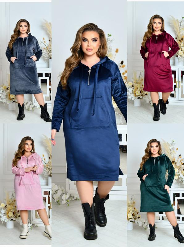 Сукня Код 7006 Тканина: велюр. Цвета: т.серый, синий, марсала, зеленый, пудра. Размеры: 52-54, 56-58, 60-62, 64-66. Длина платья: 103, 104, 105, 106 см. Обхват рукава: 44, 46, 48, 50 см. Длина рукава от горловины: 69, 70, 71, 72 см. Замеры готового изделия: 52-54 ОГ 116 ОТ 114 ОС118 56-58 ОГ 124 ОТ 122 ОС 126 60-62 ОГ 132 ОТ 130 ОС 134 64-66 ОГ 140 ОТ 138 ОС 142 На модели показан этот размер 52-54 Рост модели 174 см. Oбьемы модели ОГ 107 ОТ 88 ОБ 111 см Невероятно комфортное платье в спортивном стиле из велюра ( очень приятное на ощупь, растяжимость красива). В кулиску капюшона продет объемный шнурок из основного материала. Впереди короткая молния для удобного надевания. На передней полочке обработан карман «кенгуру». Внизу, по бокам, небольшие разрезы.