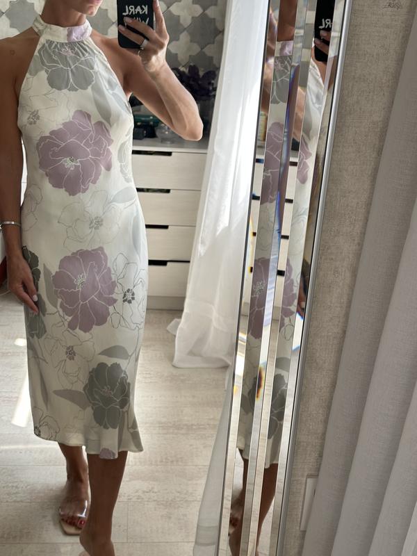 Ніжна сукня міді в квітковий принт з натурального шовку. Підклад також 100% шовк. На шийці завʼязки( можна бант) Крій по косій. Розмір 12( фактично підійде на S/невеликий М) Стан чудовий( нюанс-ледве помітні плямки після хімчистки( останнє фото,в носці не видні)- знизила ціну